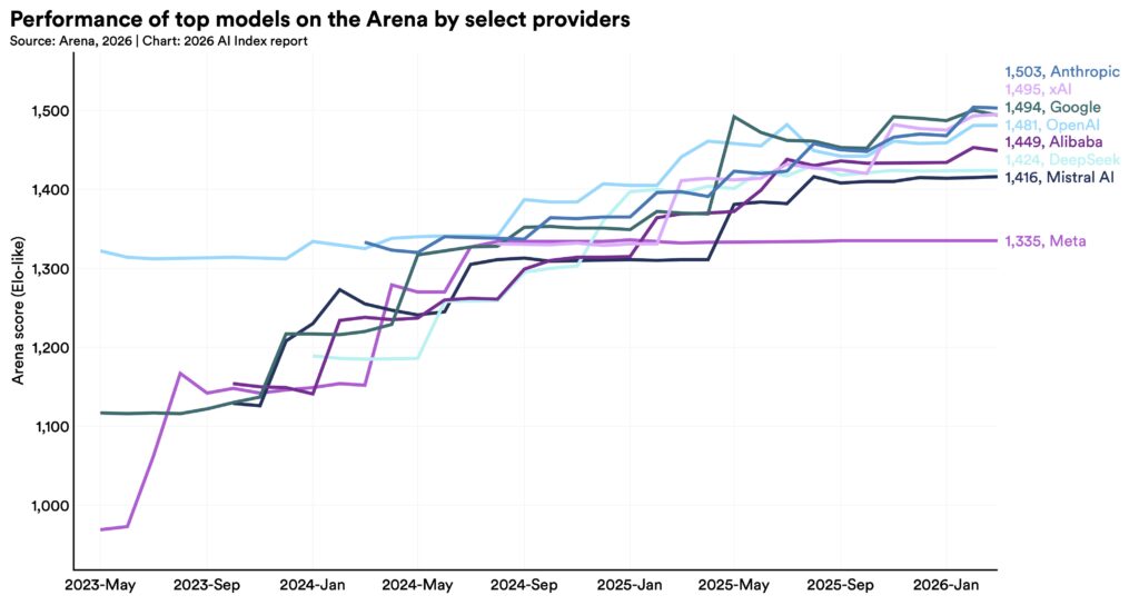If you’re following AI news, you’re probably getting whiplash. AI is a gold rush. AI is a bubble. AI is taking your job. AI can’t even read a clock. The 2026 AI Index from Stanford University’s Institute for Human-Centered Artificial Intelligence, AI’s annual report card, comes out today and cuts through some of that noise.  Despite predictions that AI development may hit a wall, the report says that the top models just keep getting better. People are adopting AI faster than they picked up the personal computer or the internet. AI companies are generating revenue faster than companies in any previous technology boom, but they’re also spending hundreds of billions of dollars on data centers and chips. The benchmarks designed to measure AI, the policies meant to govern it, and the job market are struggling to keep up. AI is sprinting, and the rest of us are trying to find our shoes. All that speed comes at a cost. AI data centers around the world can now draw 29.6 gigawatts of power, enough to run the entire state of New York at peak demand. Annual water use from running OpenAI’s GPT-4o alone may exceed the drinking water needs of 12 million people. At the same time, the supply chain for chips is alarmingly fragile. The US hosts most of the world’s AI data centers, and one company in Taiwan, TSMC, fabricates almost every leading AI chip.  The data reveals a technology evolving faster than we can manage. Here’s a look at some of the key points from this year’s report.  The US and China are nearly tied In a long, heated race with immense geopolitical stakes, the US and China are almost neck and neck on AI model performance, according to Arena, a community-driven ranking platform that allows users to compare the outputs of large language models on identical prompts. In early 2023, OpenAI had a lead with ChatGPT, but this gap narrowed in 2024 as Google and Anthropic released their own models. In February 2025, R1, an AI model built by the Chinese lab DeepSeek, briefly matched the top US model, ChatGPT. As of March 2026, Anthropic leads, trailed closely by xAI, Google, and OpenAI. Chinese models like DeepSeek and Alibaba lag only modestly. With the best AI models separated in the rankings by razor-thin margins, they’re now competing on cost, reliability, and real-world usefulness.  The index notes that the US and China have different AI advantages. While the US has more powerful AI models, more capital, and an estimated 5,427 data centers (more than 10 times as many as any other country), China leads in AI research publications, patents, and robotics.  As competition intensifies, companies like OpenAI, Anthropic, and Google no longer disclose their training code, parameter counts, or data-set sizes. “We don’t know a lot of things about predicting model behaviors,” says Yolanda Gil, a computer scientist at the University of Southern California who coauthored the report. This lack of transparency makes it difficult for independent researchers to study how to make AI models safer, she says. AI models are advancing super fast Despite predictions that development will plateau, AI models keep getting better and better. By some measures, they now meet or exceed the performance of human experts on tests that aim to measure PhD-level science, math, and language understanding. SWE-bench Verified, a software engineering benchmark for AI models, saw top scores jump from around 60% in 2024 to almost 100% in 2025. In 2025, an AI system produced a weather forecast on its own.   “I am stunned that this technology continues to improve, and it’s just not plateauing in any way,” says Gil. However, AI still struggles in plenty of other areas. Because the models learn by processing enormous amounts of text and images rather than by experiencing the physical world, AI exhibits “jagged intelligence.” Robots are still in their early days and succeed in only 12% of household tasks. Self-driving cars are farther along: Waymos are now roaming across five US cities, and Baidu’s Apollo Go vehicles are shuttling riders around in China. AI is also expanding into professional domains like law and finance, but no model dominates the field yet.  But the way we test AI is broken These reports of progress should be taken with a grain of salt. The benchmarks designed to track AI progress are struggling to keep up as models quickly blow past their ceilings, the Stanford report says. Some are poorly constructed—a popular benchmark that tests a model’s math abilities has a 42% error rate. Others can be gamed: when models are trained on benchmark test data, for example, they can learn to score well without getting smarter.  Because AI is rarely used the same way it’s tested, strong benchmark performance doesn’t always translate to real-world performance. And for complex, interactive technologies such as AI agents and robots, benchmarks barely exist yet.  AI companies are also sharing less about how their models are trained, and independent testing sometimes tells a different story from what they report. “A lot of companies are not releasing how their models do in certain benchmarks, particularly the responsible-AI benchmarks,” says Gil. “The absence of how your model is doing on a benchmark maybe says something.”  AI is starting to affect jobs Within three years of going mainstream, AI is now used by more than half of people around the world, a rate of adoption faster than the personal computer or the internet. An estimated 88% of organizations now use AI, and four in five university students use it.  It’s early days for deployment, and AI’s impact on jobs is hard to measure. Still, some studies suggest AI is beginning to affect young workers in certain professions. According to a 2025 study by economists at Stanford, employment for software developers aged 22 to 25 has fallen nearly 20% since 2022. The decline might not be pinned on AI alone, as broader macroecon
